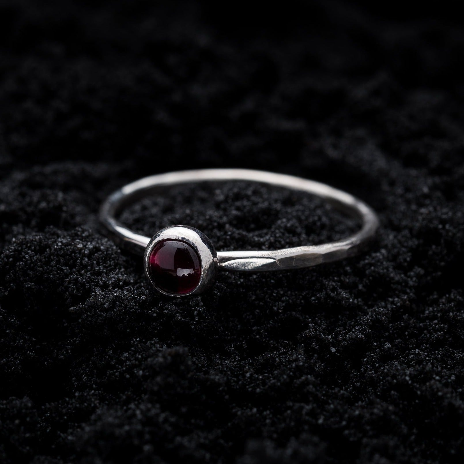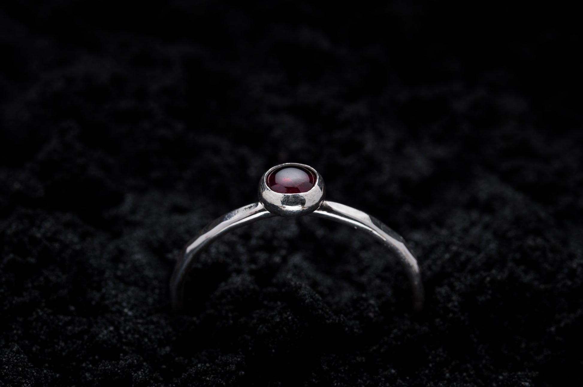 A 5mm garnet is set into a shiny bezel and sits atop a hammered sterling silver band that catches the light beautifully.
